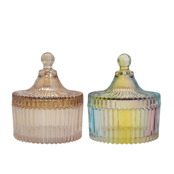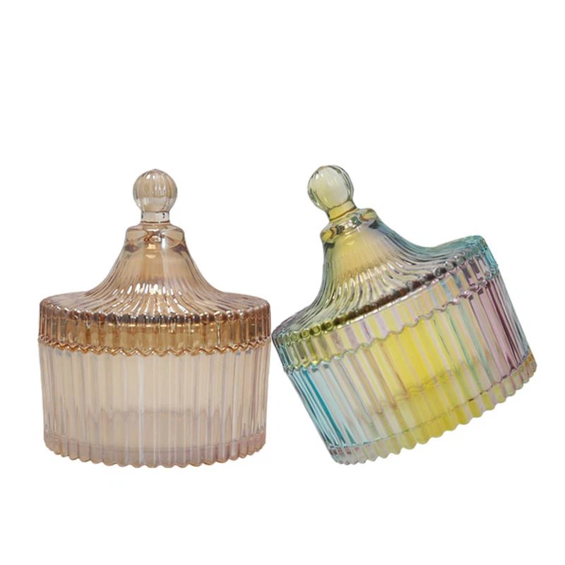 Le concepteur de ces pots à bougies élégants a créé une conception de forme et une conception de couleur spéciales. Le créateur utilise un bonnet rond creux comme base, puis utilise une forme similaire à la jupe d'une jupe tutu's pour faire le couvercle du bonnet, et une jolie petite boule est incrustée sur le dessus, qui est un cœur très féminin et un style princesse. Dans le même temps, en plus d'un design de couleur orange-rose régulier, un design de couleur arc-en-ciel a également été réalisé. La couleur est très spéciale, brillant sous la lumière, ce qui peut beaucoup attirer l'attention des invités.